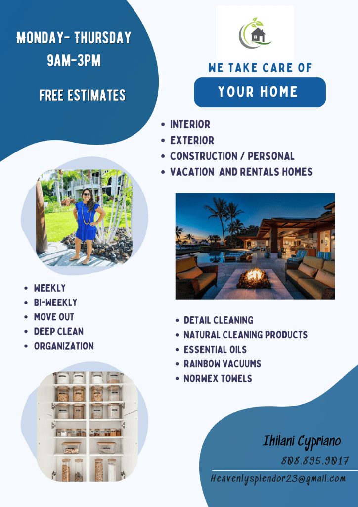 Contact Ihilani at (808) 895-9017 or Email at heavenlysplendor23@gmail.com